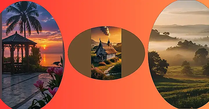 This picture is like something straight out of a storybook! It’s got a cute little cottage that looks like it could belong to a friendly gnome or a mischievous fairy. The house is all made of wood and has a super cool thatched roof, like something you’d see in a movie about medieval times. And just look at the beautiful golden light coming through the clouds! It’s almost like the sun is saying, “Hey, let’s have a magical adventure!”