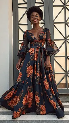 Imagine this: You’re walking down the street, leaves crunching under your feet, and you’re rocking a dress that’s as cozy and stylish as a warm cup of pumpkin spice latte. That’s the feeling you get with this fall maxi dress! It’s got all the warm tones and cozy vibes of fall, with a touch of floral flair to keep things interesting. The long, flowing skirt makes it perfect for twirling in the park or grabbing a pumpkin-flavored treat at your favorite coffee shop. This dress is the ultimate outfit for those cooler days, and it’s sure to turn heads wherever you go.