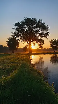 It’s almost as if the tree is whispering secrets to the rising sun, telling it about all the exciting things the day will bring. The mist hanging over the water looks like a giant, soft hug from the sky, wrapping the whole scene in a warm and fuzzy feeling. I bet if you were there, you could hear the birds chirping and the frogs croaking, all happy to be welcoming a brand new day!