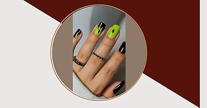 These nails are seriously giving us Halloween vibes, but with a touch of class! It’s like a witch went to a fancy dress party and decided to ditch the traditional black for a more playful green. The little black flames on the green nails look like they’re about to burst into a spooky dance, while the all-black nails are ready to cast a mysterious spell.