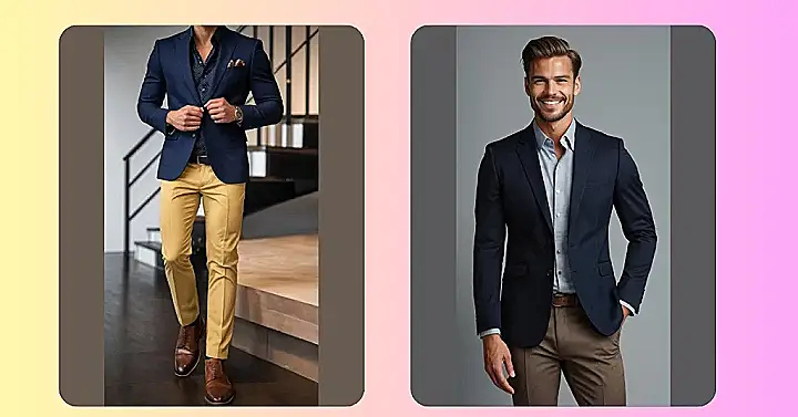 This guy’s got the “mens formal outfits” thing down pat! Look at that sharp blue blazer. It’s like a superhero cape for grown-ups. And those mustard-yellow pants? They’re like a sunshine explosion in his wardrobe! It’s a bold choice, but it totally works. He’s like the coolest dude at the school dance, ready to impress everyone with his amazing style.