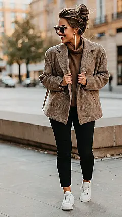 This outfit is like a cozy hug on a chilly fall day! Our model is rocking a stylish, midsize fall look that’s perfect for running errands, grabbing coffee with friends, or just strolling around town. Her plaid blazer is a total statement piece, and it looks super cozy with the turtleneck sweater underneath. And let’s not forget those awesome white sneakers! They add a touch of casual coolness to the look, and they’ll keep your feet comfy all day long.