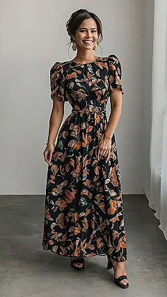 Imagine this: You’re walking down the street, leaves crunching under your feet, and you’re rocking a dress that’s as cozy and stylish as a warm cup of pumpkin spice latte. That’s the feeling you get with this fall maxi dress! It’s got all the warm tones and cozy vibes of fall, with a touch of floral flair to keep things interesting. The long, flowing skirt makes it perfect for twirling in the park or grabbing a pumpkin-flavored treat at your favorite coffee shop. This dress is the ultimate outfit for those cooler days, and it’s sure to turn heads wherever you go.