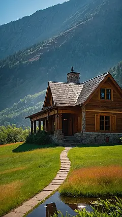 This picture shows a beautiful house nestled in the foothills of a mountain range. It looks like the perfect place to relax and enjoy the peace and quiet of nature. The house itself is gorgeous, with a stone exterior and a big, welcoming porch. There’s a big, green lawn where you could play games or have a picnic. I bet you could even see the stars at night.