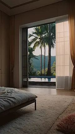 Imagine waking up to the sound of birds chirping and the sun shining through your window. You’re in a plush, comfy room, maybe even a hotel room, with a fluffy rug and a big, comfy bed. You open the sliding glass doors, and bam! – you’re greeted by a view that could only be described as “tropical dream”. Palm trees sway gently in the breeze, a shimmering pool beckons you for a swim, and lush green mountains stretch out in the distance. You could practically smell the fresh air and hear the waves crashing on the shore! This is the kind of getaway anyone would love, and that’s what this picture makes you feel: like you’re ready to kick back, relax, and just enjoy the simple pleasures of life.