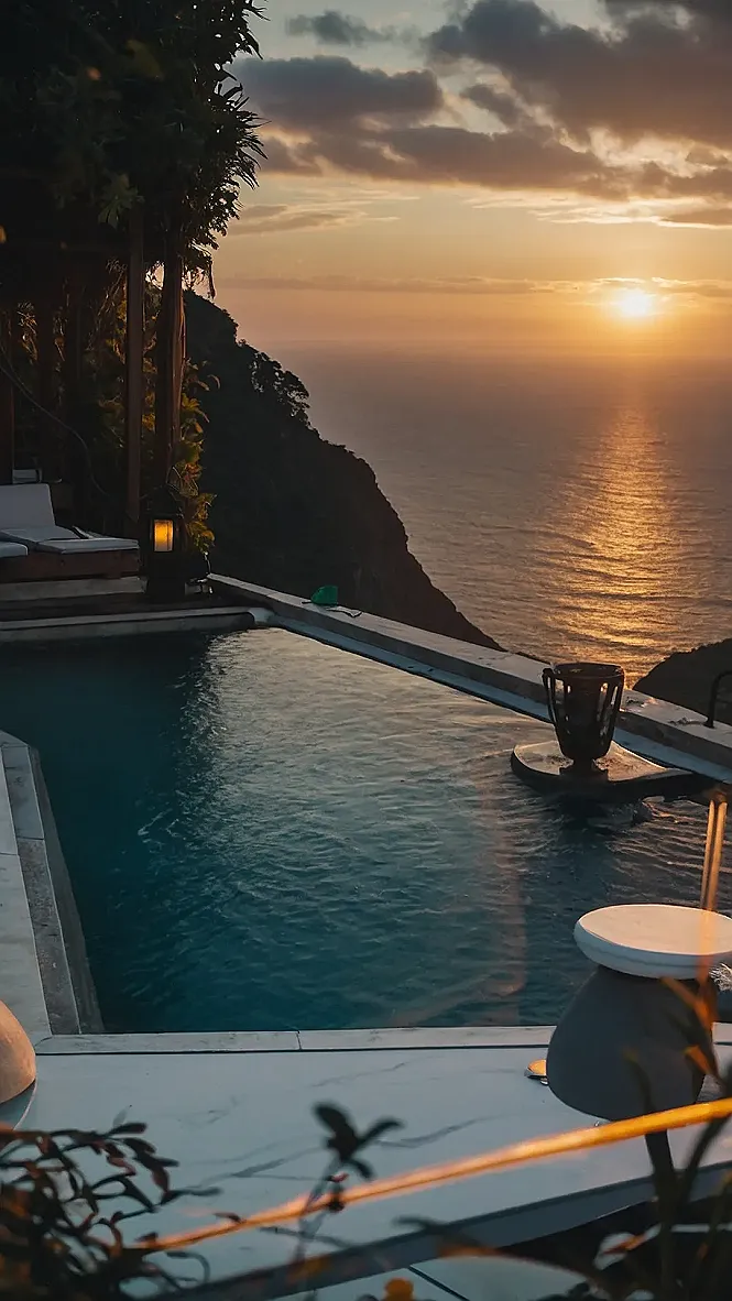The picture shows a luxurious swimming pool with a breathtaking view of the sunset over the ocean. You can almost feel the warm air and smell the salty breeze! It’s like you’re sitting on the edge of a cliff, with nothing but the vast ocean and the golden sky in front of you. Imagine taking a dip in that crystal-clear water and enjoying the peace and quiet of this amazing spot. It’s the perfect place to escape the hustle and bustle of life and just chill out.