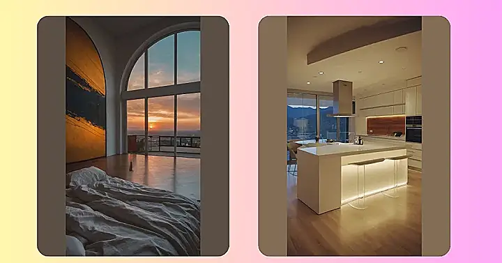 Imagine waking up to this view every morning! This cozy living room with its floor-to-ceiling windows is the ultimate spot to relax and watch the sunset. The warm glow of the lights and the comfy couch make it the perfect place to curl up with a good book or just enjoy the peace and quiet. It’s like something out of a magazine, right? And that huge window? It’s like your own personal movie screen for the most breathtaking sunset show ever!
