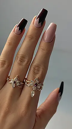 These nails are giving us major “goth princess” vibes! Who knew black and pink could be so sophisticated? Imagine sporting these at a school dance… all eyes on you! The jagged lines of the black are like a little touch of rebellion, but the light pink on the other nails keeps things sweet and trendy. Plus, those rings are the perfect touch for a sophisticated, and slightly dramatic, look. This combo is definitely a step up from your basic french manicure!