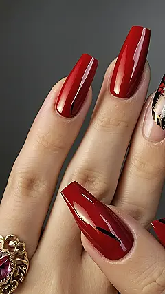 These nails are totally rocking the “nature” look! That deep red is like the color of autumn leaves, and the gold rings with the twig and feather designs just scream “outdoorsy.” It’s like the forest on your fingers! You could totally imagine walking through a forest with these nails. They’re subtle but really unique, and they’d look amazing with a comfy sweater, right?