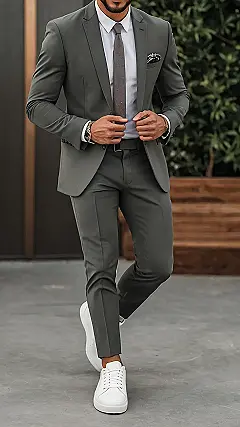 This look reminds me of the guys in my class who try to look fancy but end up looking like they’re going to a wedding. They’re all about the suit and tie, but they forget that sometimes you need a little something to break up the formality. This guy’s showing us that a little bit of casual can go a long way. He’s like the cool uncle who knows how to dress for any occasion. And honestly, who wouldn’t want to be that guy? Just imagine the confidence! He’s totally owning that look, and he’s inspiring us to try something new, too. Maybe a suit and sneakers are the next big thing!