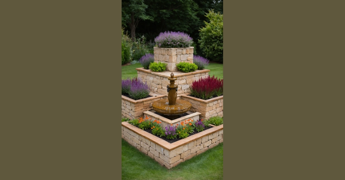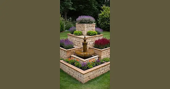 And right in the middle, we have the ultimate chill zone: a gurgling fountain! It’s probably the garden’s personal sound machine, constantly whispering soothing water noises to all the flora, making sure everyone stays hydrated and relaxed. This whole setup screams “outdoor gardens design done right,” showing how mixing cool stone with pops of color and a splashy centerpiece can turn any backyard into a place where even a grumpy cat would want to take a nap.