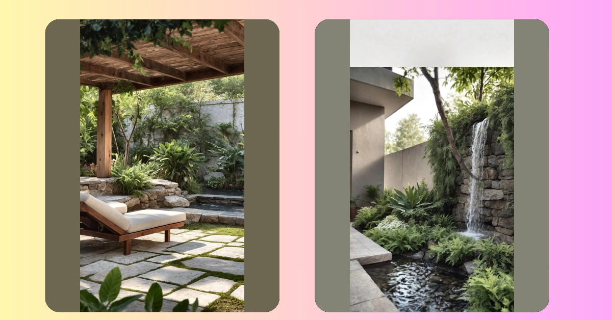Look closer, and you’ll spot all the clever details crammed into this awesome setup. That wooden pergola overhead isn’t just for looks; it’s practically a built-in shade machine, perfect for keeping things cool while you’re unwinding. With all those lush ferns and leafy plants climbing the walls, it feels like your own secret jungle hideout, complete with cool stone paths and even a little gurgling water feature to complete the vibe. It just goes to show that a small garden can be totally epic, offering everything from a peaceful spot to read a book to the perfect backdrop for your next funny selfie.