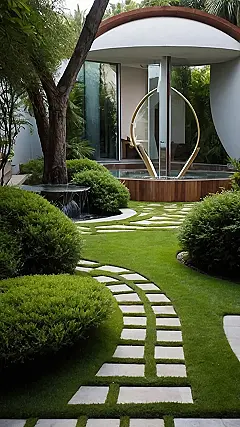 This garden is so chill, it’s practically meditating. It’s like they hired a super-organized gardener who’s also a minimalist artist. Instead of a crazy jungle of flowers and veggies, it’s got perfectly trimmed bushes, a stone path that looks like it was planned by a robot, and a single fancy tree showing off its waterfall skills. Seriously, it’s the kind of garden that makes you want to take off your shoes and contemplate the meaning of life (or at least, the meaning of a perfectly manicured lawn).