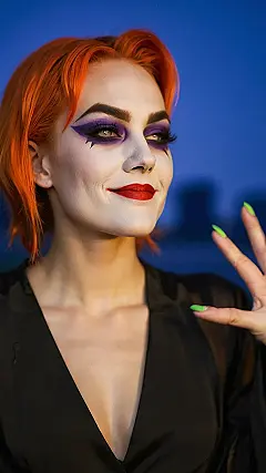 This lady’s got the Joker’s smile down pat, but with a totally different twist! Forget the green hair and purple suit – this Joker’s rocking bright orange hair and a sleek black top, and she’s definitely not afraid to show off her sense of style. With her fierce makeup and a playful wink, this Joker’s ready to steal the show and maybe even scare a few people along the way!