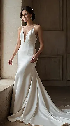 This dress is seriously stunning, right? It’s like something out of a fairytale, but way more modern and chic. Imagine yourself walking down the aisle in this sleek, sophisticated gown. It’s got that perfect blend of elegance and a touch of “wow” that every bride wants. It’s the kind of dress you’d see in magazines featuring “new bridal dress designs,” but even better in person — because you get to wear it! No awkward princess-y puff sleeves here, just pure, graceful gorgeousness.