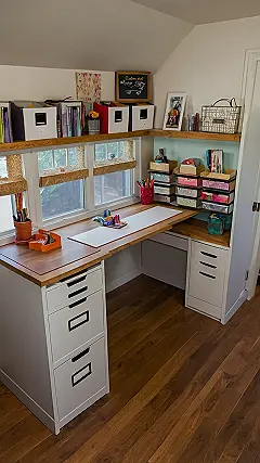This craft room office looks super organized, unlike my backpack after a week of school. Check out all those shelves! They’re like little landing pads for all your crafty supplies, from glitter glue that will inevitably end up everywhere, to that one roll of washi tape you bought and never used. But hey, at least it *looks* good up there, right?