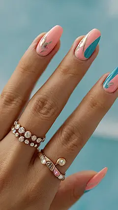These nails are so long, they’re basically their own little fashion show! You’ve got your classic nude with a touch of shimmer, then there’s the “I’m-not-afraid-to-be-bold” design with those swirly, golden patterns. And let’s not forget the blinged-out ring! It’s like this hand is saying, “Look at me! I’m fabulous!”