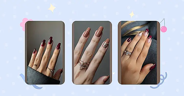 Those nails are giving us major autumn vibes! The rich maroon color is like a cozy sweater for your fingertips, perfect for all those pumpkin spice lattes and chilly nights. It’s a classic look that never goes out of style, and it’s totally easy to wear with everything from jeans to your favorite fall dress. The sparkle on the ring is a nice touch too, like a little bit of glittery fun in the fall air!