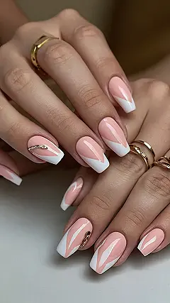 These nails are seriously cute! Imagine showing up to your Valentine’s Day party with these gorgeous pink and white beauties. They’re like a little Valentine’s Day message on your fingertips – sweet, stylish, and totally Instagram-worthy. That subtle V-shaped design adds a touch of elegance, and those tiny gold accents are just the cherry on top. Prepare for all the compliments!