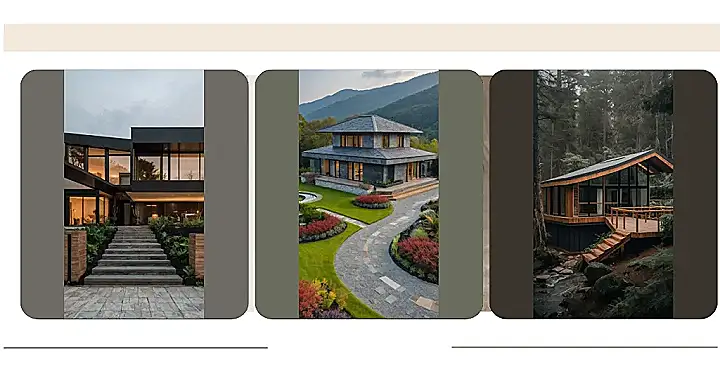 **Paragraph 1:** Imagine this: you’re chilling in your super-stylish nature house, which looks like it belongs in a nature magazine photoshoot (seriously, check out those mountain views!). The house itself is all sleek grey stone, kind of like a sophisticated giant Lego castle, and it’s nestled perfectly in the landscape. But the real showstopper is the garden. It’s not just your average lawn; it’s a winding path of cool grey stones snaking through bursts of vibrant red and yellow plants. It’s like nature itself decided to get crafty and create the ultimate outdoor art project!