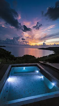 Imagine this: you’re chilling by a pool, the sun is setting, painting the sky in beautiful shades of pink and purple. The water is sparkling and inviting, and you can hear the gentle waves crashing in the distance. It’s the kind of place where you can just relax and forget about all your worries. You could be a famous movie star in a luxurious villa, or maybe you’re just on vacation with your family. Either way, this picture screams ‘calm location,’ doesn’t it?