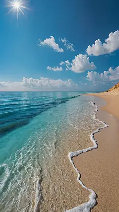 Feeling that mid-week slump or just need a mental break from algebra? Feast your eyes on this! This isn’t just a pretty picture; it’s peak ‘nature wallpaper aesthetic’ delivered right to your screen. The sun up there is basically a giant spotlight saying, “Hey, check out this amazing beach!” And honestly, who needs a filter when the sky is that perfectly blue, dotted with clouds that look like they’re ready to float into your DMs? This image is so vibrant, it practically smells like sunscreen and good vibes, making it the ultimate background upgrade for anyone tired of staring at, well, anything else.