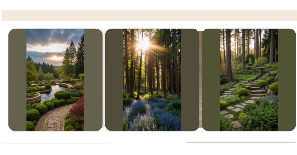 Step right up to the coolest spot where the forest meets a seriously awesome garden! It’s like the big, wild trees in the back decided they needed some chill, organized friends, so they hung out with these perfectly shaped bushes and a pond that looks like it’s having a really peaceful afternoon. Wandering down the stone path here feels like you’re on a secret mission, maybe to find out which plant is the best at standing still or how the water got so calm and reflective, especially when the sun decides to put on a show and make everything glow like a video game level unlock.