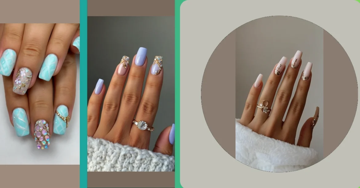 So, you’re rocking the light blue nails? Cool! It’s like you’re carrying a tiny piece of the summer sky around with you. But let’s be real, the real showstopper here are the bedazzled nails and the epic ring! It’s almost like you’re ready to accept an Oscar or maybe just a really, really big slice of pizza. Either way, those nails are making a statement!