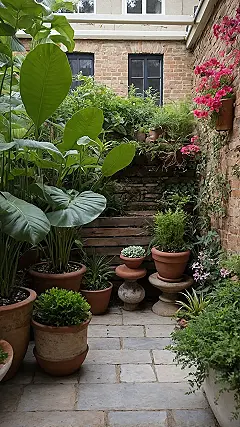 Welcome to the ultimate garden nook, where every plant seems to be having its own little party! Just check out those massive, leafy giants chilling in their pots, practically high-fiving the sky. And don’t miss the smaller green crew nestled around, looking super cozy against the old brick wall. It’s like a secret botanical hideout, with pink flowers casually spilling down the wall, probably just showing off. This isn’t just a corner; it’s a bustling plant paradise that looks ready for you to pull up a comfy chair and join the green gang.