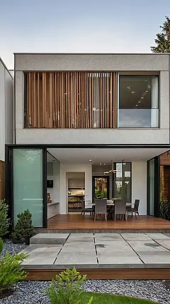 This renovated house is not your grandma’s fixer-upper! Just look at it – sleek lines, modern design, and enough glass to make you feel like you’re living in a super-fancy aquarium! Forget peeling paint and squeaky floors; this place is all about smooth surfaces, stylish wooden accents, and a patio that’s practically begging you to have a barbeque (or maybe just chill with a good book). Imagine hosting pizza night here – the envy of all your friends!