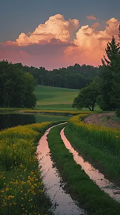 This picture is like a postcard from a peaceful planet! Imagine strolling down those little watery paths, the sunset painting the sky in gorgeous pink and orange hues, reflected perfectly in the puddles. It’s the kind of place where you could totally forget about homework (just for a little while!), and just breathe in the fresh air and the sweet smell of those yellow wildflowers. Seriously, it’s so calm and beautiful, it’s almost unreal – like a nature scene straight out of a fairytale!