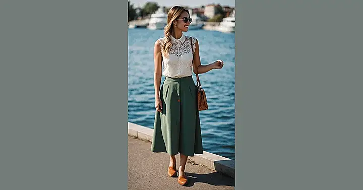Forget those old-school ideas about picnic outfits needing to be super casual or, worse, something you wouldn’t mind getting grass stains on. This look completely redefines outdoor dining! With that gorgeous white lace top and the flowing green skirt, you’re not just heading to a picnic; you’re gracing the waterfront with some serious style. It’s the kind of outfit that whispers, “Yes, I brought the gourmet cheese, but also, please admire my perfectly coordinated ensemble while I subtly sip my sparkling cider.”