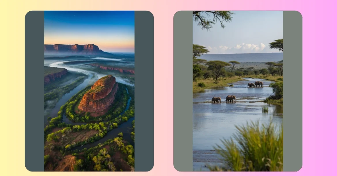 That river has some serious moves, doesn’t it? It practically twists and turns like a noodle trying to escape your plate, all while showing off the stunning green trees and ancient, rust-colored mountains. It makes you wonder if the river takes pride in perfectly circling that colossal rock, thinking, “Yep, I’m the coolest river in Africa, giving this mountain a stylish embrace!” This view isn’t just a pretty picture; it’s an open invitation to explore the wild heart of Africa, proving that nature is the ultimate artist and a total pro at posing for amazing photos.