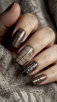 Did your favorite flannel shirt just shrink and magically turn into these super cool plaid nails? Because that’s totally the vibe these gorgeous designs are giving off! With those warm browns, creamy beiges, and sleek black lines (plus a touch of gold that screams ‘I’m fancy but still want to binge-watch Netflix’), these aren’t just nails; they’re a miniature fashion statement for your fingertips. It’s like wrapping your hands in the coziest, most stylish blanket you own, but, you know, without the hassle of actually carrying a blanket everywhere.