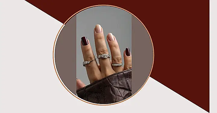 Look at these fingers, practically dripping in dazzling rings and sporting a serious fashion statement with that quilted glove! The nails themselves are playing a cool game of “mix and match” with a rich, dark maroon and a soft, natural nude. While they’re currently rocking a sleek, solid look, it’s pretty easy to picture how these shades could be the *perfect* base for some amazing plaid nail designs. Think about it: a deep maroon background with thin, contrasting lines, or maybe even subtle plaid patterns over the nude for a softer vibe. These nails are just begging to be transformed into a cozy-chic masterpiece, ready for fall fashion or a killer school outfit!