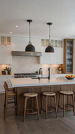 That huge island isn’t just for meal prep; it’s practically a command center for snacks, homework (maybe?), and all the important chats. With those stylish bar stools lined up, it’s the perfect spot to hang out while someone else makes dinner, or to silently judge your siblings’ breakfast choices. Plus, with all that natural light flooding in from those massive windows, you’d almost forget you’re doing dishes… almost. It’s the kind of designer kitchen where even microwaving leftovers feels like a five-star culinary experience.