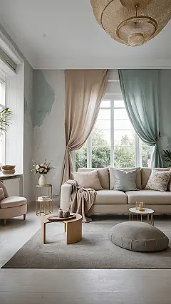 Looks like this wall decided to get a spa day! Instead of just being, you know, a plain old wall holding up the ceiling, it’s rocking this cool watercolour-y art. It’s like the wall said, “I’m tired of being basic, give me some artistic flair!” And honestly, it totally works. It makes the whole room, with that super comfy-looking couch and chill lighting from the window, feel extra relaxed. This isn’t your grandma’s floral wallpaper; it’s a wall painting that looks like soft clouds having a gentle paint fight.