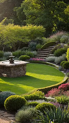 And right in the middle, we have the ultimate chill zone: a gurgling fountain! It’s probably the garden’s personal sound machine, constantly whispering soothing water noises to all the flora, making sure everyone stays hydrated and relaxed. This whole setup screams “outdoor gardens design done right,” showing how mixing cool stone with pops of color and a splashy centerpiece can turn any backyard into a place where even a grumpy cat would want to take a nap.