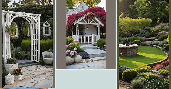Forget about boring backyards; this place is like stepping into a fairytale, complete with a super cool white archway that basically screams, “Adventure (or at least a really comfy nap) awaits!” This whole scene is a masterclass in outdoor gardens design, proving that your green space can be way more than just grass. With those neatly trimmed hedges and fancy windows peeking out, it feels like a secret world where you can escape your homework and pretend you’re royalty, even if only the squirrels are watching.