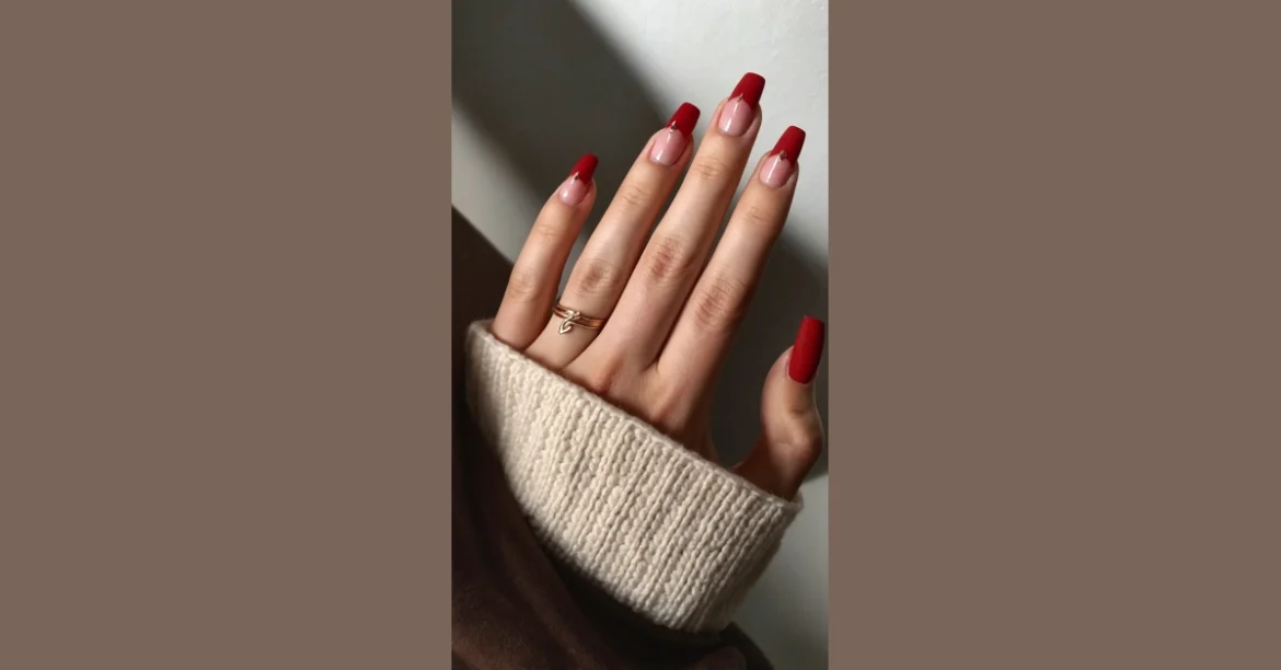 Plus, let’s not ignore that super cute ring playing peek-a-boo and that cozy sweater, making the whole vibe extra warm and stylish. These nails are basically saying, “I’m ready for anything, whether it’s acing a pop quiz or just chilling with hot chocolate.” If you’re looking for red nail designs that don’t just sit there but actually make your hands feel like they’re ready to host their own talk show, this glittery masterpiece is definitely a winner. Prepare for endless compliments and maybe even some accidental finger pointing in excitement!