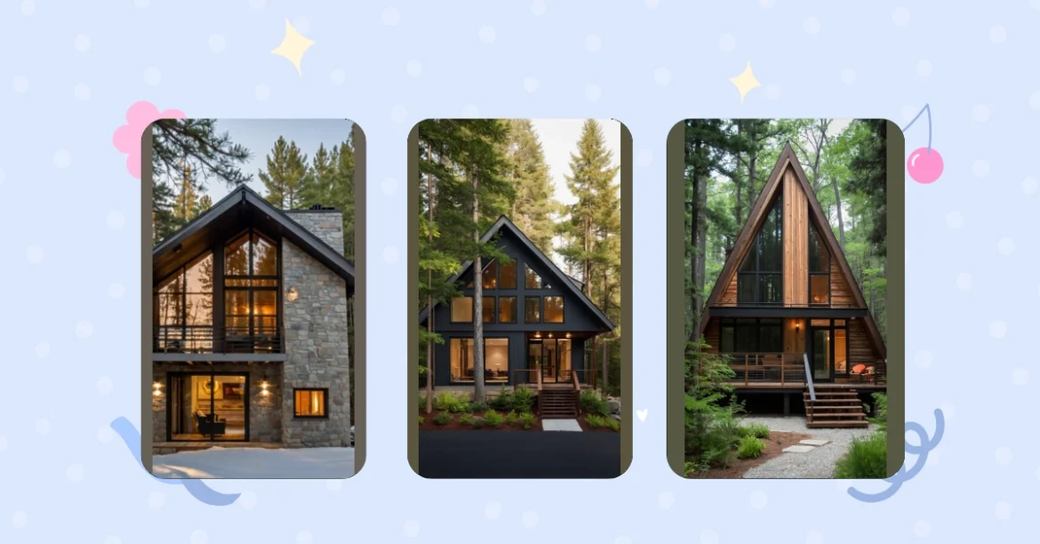 Forget roughing it! This cabin house is all about sophisticated comfort. The stone exterior is seriously stylish, and those sleek black windows add a touch of modern elegance. The garage doors even look cool! You can picture yourself pulling up in your awesome car (maybe an electric one to keep it eco-friendly?) and heading inside to your cozy, light-filled haven. This cabin isn’t just a house; it’s a statement – a statement that says, “I appreciate the finer things in life, but I also really love nature.”