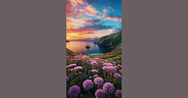 Get ready for a screen upgrade that’s basically a hug for your eyes! This isn’t just any photo; it’s a full-on visual vacation packed into a cute wallpaper. Look at those fluffy pink flowers practically popping out to say hi, like they’re throwing a party on the side of a cliff. And that sky? It’s showing off all the best colors, from fiery orange to cool blue, looking like a painter went wild with a giant brush. It’s the kind of view that makes you feel instantly happier, even if you’re stuck doing homework.
