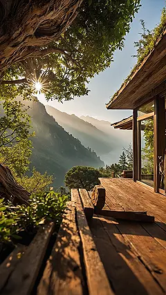 Who needs a boring old view when you could have this epic adventure just beyond your glass? Think about sipping your morning smoothie on that cool wooden deck, surrounded by nature so peaceful you’d almost forget about that upcoming history test. The sun peeking through the gnarled tree, those misty mountains, and even that adorable little cabin practically scream ‘zen mode activated.’ This isn’t just a picture; it’s a window wallpaper that whispers, ‘Psst, you’re secretly on top of the world, even if you’re just in your bedroom.’ It’s like having a superpower to make boring walls disappear and be replaced by pure, unadulterated awesome.