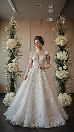 Looking at this wedding dress, you can almost hear the trumpets playing and picture yourself waving from a royal balcony. It’s got all the regal vibes, from the elegant long lace sleeves that make you feel instantly fancy, to the beautiful flowing skirt adorned with delicate patterns. This gown practically screams “future monarch” ready for her big day, making everyone wonder if a crown is hidden somewhere in those gorgeous locks! It’s definitely not your average outfit for a trip to the grocery store, that’s for sure.