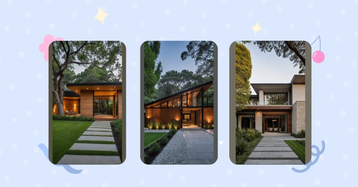 That arched front door isn’t just an entrance; it’s basically a fancy portal inviting you to a world of comfy couches and maybe a secret snack stash. Those cool lanterns flanking the door look like they’re ready for a party, and all the green plants aren’t just for show – they’re probably whispering secrets about how awesome it is to live here. This isn’t your grandma’s ranch house (unless your grandma is super hip and lives in a modern masterpiece!). It’s the kind of place where you could chill after school, kick back, and feel totally at home, probably without even having to do the dishes.