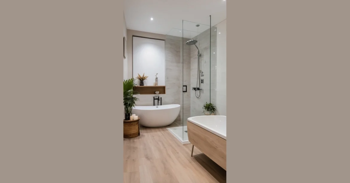 And it’s not just about the fancy waterworks; the whole vibe here is super chill thanks to some really smart bathroom interior design choices. See all those cool green plants? They’re like little roommates making sure you feel refreshed, and probably judging your singing skills, all while adding a touch of nature. The warm wooden floor in the shower area feels way nicer than cold tiles, giving it a cozy, natural feel, almost like showering in a stylish treehouse. This space proves that with a few clever ideas – like adding natural elements and awesome lighting – even a simple shower can become the coolest spot in the house, maybe even cooler than your bedroom!