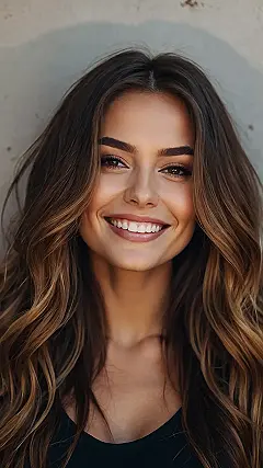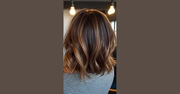 The picture shows hair that looks like a warm hug for your locks. It’s all about beautiful brown hair with streaks of lighter brown, like the leaves changing color in the fall! It’s like taking the best parts of summer, those golden rays of sunshine, and bringing them to your hair.