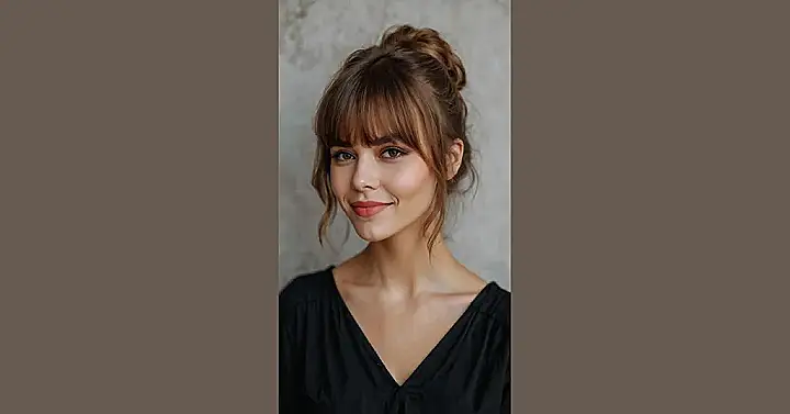 You know how sometimes your hair just *gets it*? Well, this look with the trendy bangs and that perfectly messy bun is totally getting it. Our friend in the picture here is rocking a classic bangs haircut that instantly gives her face a cool, fresh frame. It’s like her forehead got a stylish new curtain, making her eyes sparkle even more and giving off major chill vibes. Plus, it’s a genius move for those days when you want to look put-together without, you know, actually trying *too* hard – just pull your hair up, let those bangs do their thing, and boom, instant style winner!