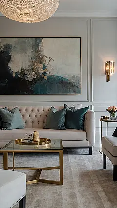 This isn’t just a living room; it’s practically a museum exhibit where the art isn’t just on the wall, it’s the entire setup! You walk in here and suddenly feel the urge to speak in a British accent and discuss the stock market, even if you just finished a TikTok dance. With that super plush sofa and those fancy velvet pillows, it looks so comfy you’d probably sink in and never want to do homework again. Just be careful not to bring your muddy shoes in; this carpet looks like it has a personal bodyguard for cleanliness.