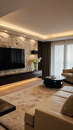 And that wall! Forget about painting – this is like living inside a cool, abstract sculpture. Plus, the lighting makes the whole room glow like it’s straight out of a movie. Just add some friends, a video game console, and you’ve got the ultimate hangout spot. Who needs to go out when you have living room furniture this awesome?